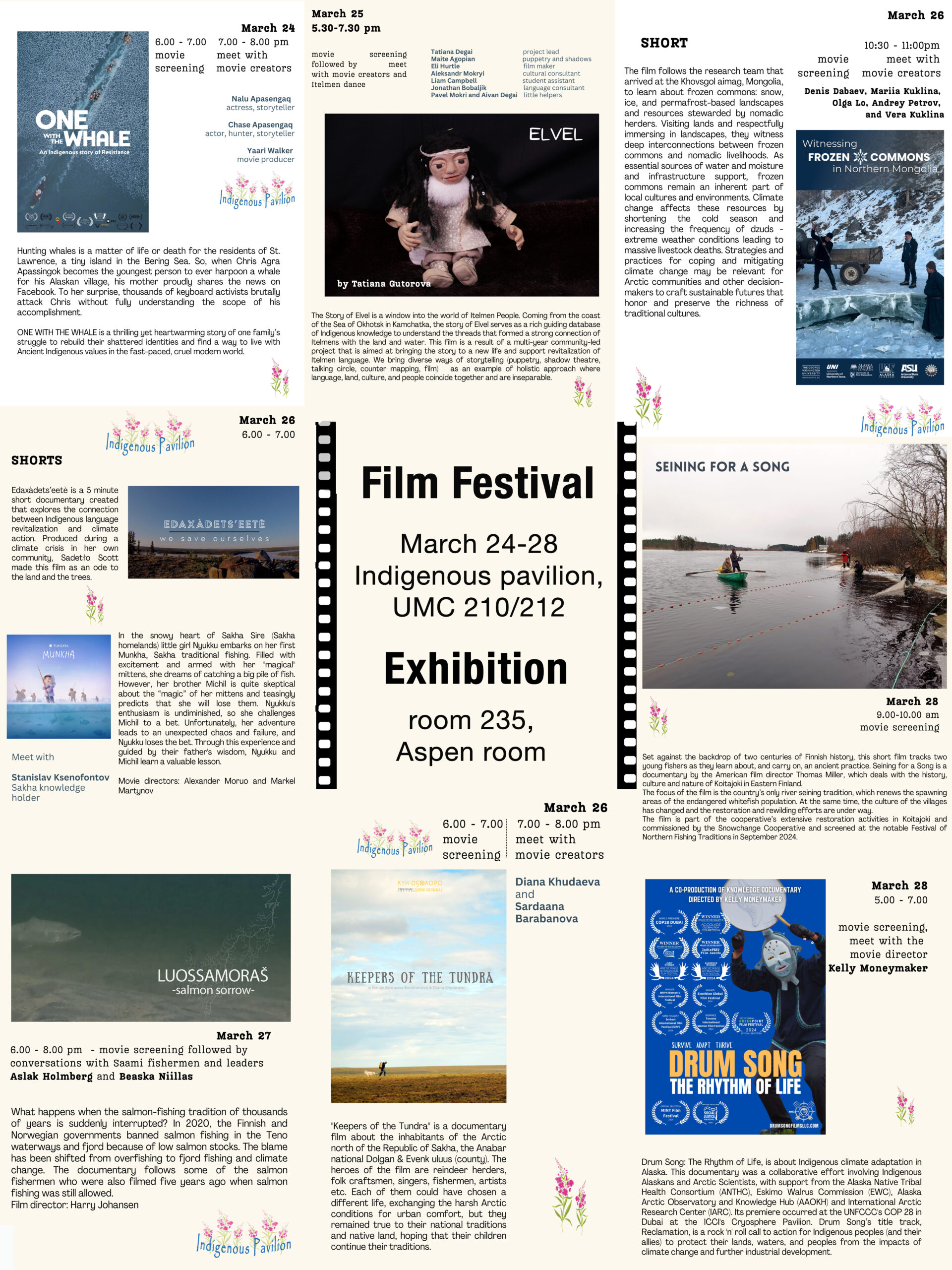 The Indigenous Film Festival, curated by Tatiana Degai (University of British Columbia, Canada), was held at the Indigenous Pavilion from March 24 to 28, 2025. The festival featured several films created in collaboration with the Frozen Commons project.